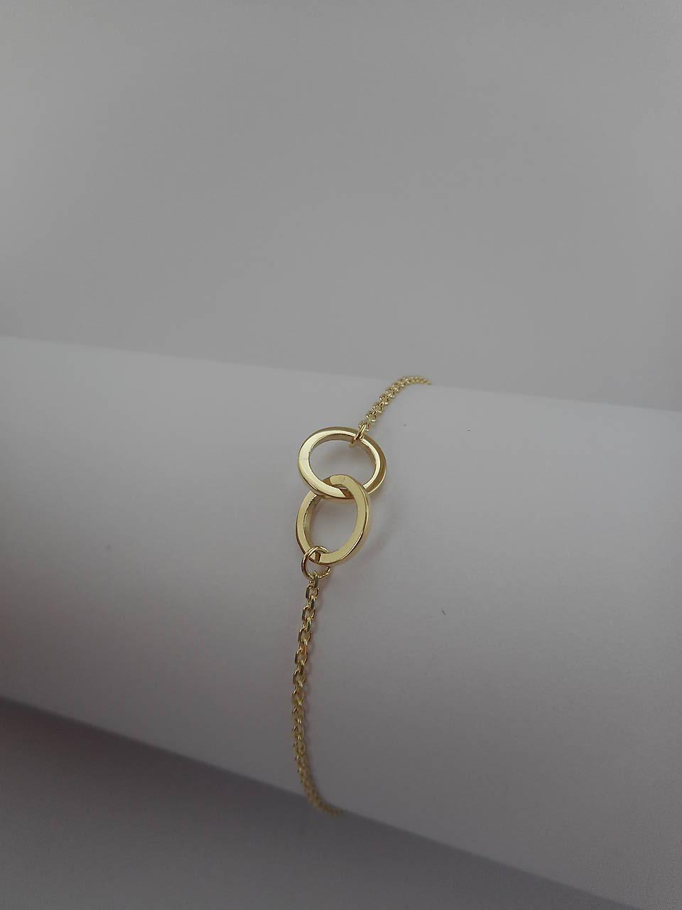 Ručne robený náramok pozostávajúci z dvoch cez seba "previazaných" krúžkov na jemnej, ale pevnej retiazočke. Tento náramok vieme vyhotoviť v bielom, alebo žltom prevedení.
